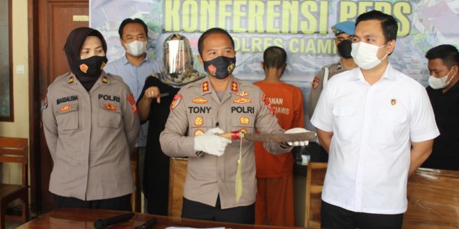 “Tim Satreskrim Polres Ciamis tidak membutuhkan waktu lama untuk mengamankan tersangka BD. Kejadian terjadi pada tanggal 4 September 2022 dini hari, dan hari itu juga berhasil kami amankan,” kata Kapolres Ciamis AKBP Tony Prasetyo Yudhangkoro, S.H., S.I.K., M.T., didampingi Kasat Reskrim Polres Ciamis AKP Muhammad Firmansyah, S.I.K., dan Kasi Humas Polres Ciamis Iptu Magdalena NEB., dalam konferensi pers di Mapolres Ciamis. Selasa (27/9/2022).