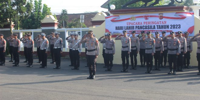 Polres Ciamis – Jajaran Polres Ciamis Polda Jawa Barat melaksanakan upacara bendera dalam rangka peringatan Hari Lahir Pancasila Tahun 2023. Upacara ini dilaksanakan di Lapangan Apel Makopolres Ciamis, Jalan Jend. Sudirman No.271, Sindangrasa, Ciamis, Kabupaten Ciamis, Jawa Barat, Kamis (1/6/2023).