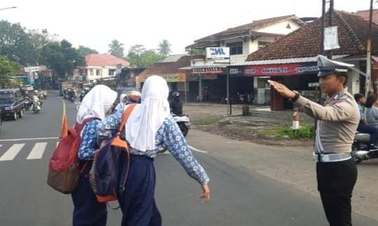 Polres Ciamis Polda Jabar,- Polsek Cikoneng Polres Ciamis Polda Jabar melaksanakan giat strong point pagi/pengaturan arus lalu lintas dengan sasaran anak sekolah pada Kamis (3/8/2023).