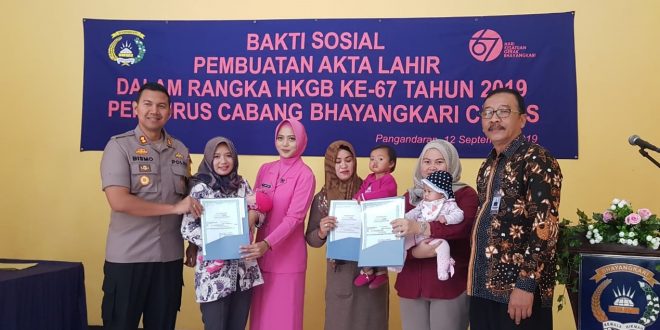 Polres Ciamis – Telah dilaksanakan Kegiatan Bakti Sosial Pembuatan Akta Kelahiran Anak dalam rangka HKGB Ke – 67 tahun 2019 dari Pengurus Cabang Bhayangkari Ciamis bertempat di Aula Prasetya Polsek Pangandaran. Kamis pukul 09.30 wib s/d pukul 11.00 wib (12/09/2019).