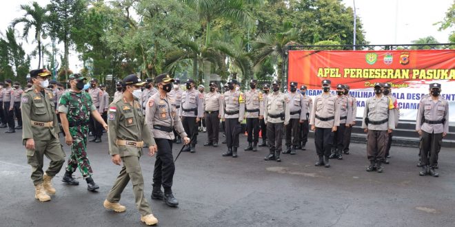 Polres Ciamis – Kapolres Ciamis AKBP Tony Prasetyo Yudhangkoro, SH., S.I.K., M.T., bersama Dandim 0613/Ciamis Letkol Inf Wahyu Alfiyan Arisandi, S.I.P., M.I.Pol., mengikuti Apel Pergeseran Pasukan Pengamanan Pilkades Serentak Tahun 2022 di Kabupaten Ciamis. Apel tersebut digelar di halaman Pendopo Kabupaten Ciamis. Jumat (25/03/2022).