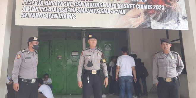 Polres Ciamis – Personel Satuan Sampata Polres Ciamis Polda Jabar melaksanakan pengamanan Turnamen Bola Basket Bupati Cup antar pelajar tingkat SD, SMP, SMA Sederajat se-Kabupaten Ciamis. Pengamanan dilaksanakan dikawasan sekitar Gelanggang Galuh Taruna (GGT) Ciamis, Kabupaten Ciamis, Jawa Barat, Sabtu (18/02/2023).