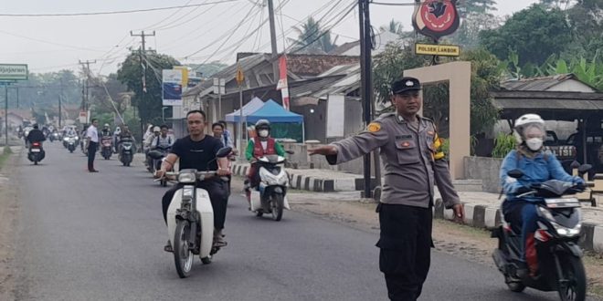 Tampak terlihat Brigadir Diko Pudjoko anggota Polsek Lakbok Polres Ciamis Polda Jabar memberikan pelayanan masyarakat di pagi hari. Anggota hadir untuk melakukan pengaturan lalu lintas dan membantu warga menyebrang.